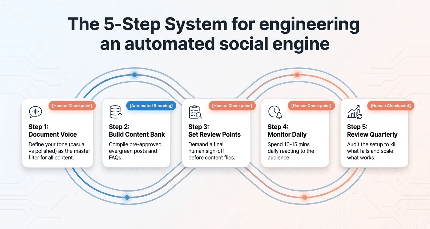 Setting up automation isn't just picking a tool and connecting your accounts. You need a system that holds your brand voice together even when a machine is doing part of the work.