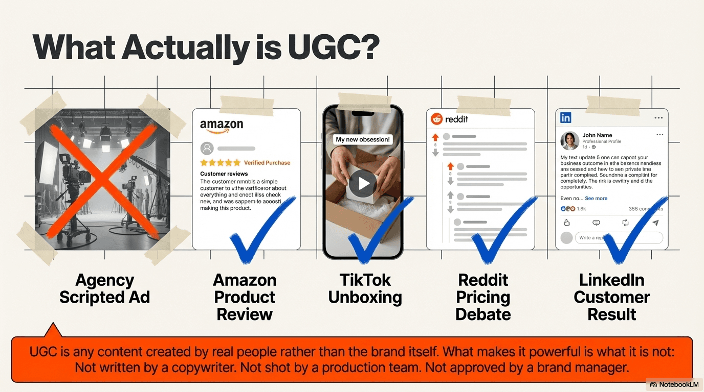 The user-generated content definition goes beyond social media. An Amazon review is UGC. A YouTube tutorial is UGC. A Reddit thread about your pricing is UGC. A LinkedIn post sharing results is UGC. If a real user makes it without a script, it is UGC.